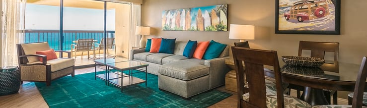Prtial ocean view suites located on the lower tower floors feature private furnished balconies overlooking Waikiki Beach. These two-bedroom suites are ideal for families and small groups with a spacious living area, fully equipped kitchen, washer/dryer, and central air conditioning for added comfort.