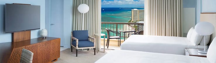 Relax in a spacious 435-square-foot room with a king bed or two queen beds overlooking breathtaking ocean views of Waikiki Beach. Watch spectacular sunsets from the privacy of your lanai (balcony) over majestic palm tree-lined Kalakaua Avenue.